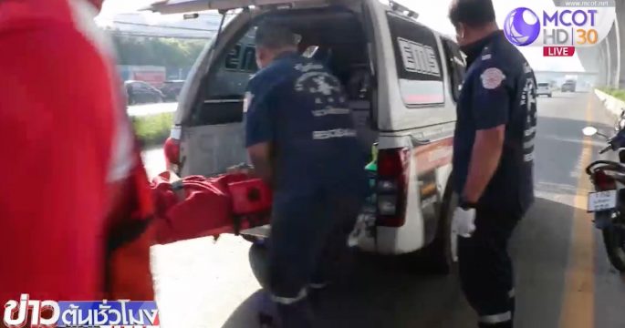 หน่วยกู้ภัยฉะเชิงเทรา เข้าปฐมพยาบาลผู้ขับขี่รถจักรยานยนต์บิ๊กไบค์ หลังถูกรถบรรทุกเฉี่ยวชนจนได้รับบาดเจ็บบนถนนเทพรัตน
