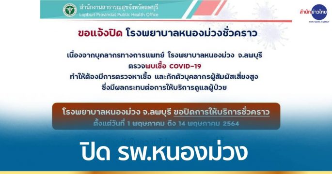 สสจ.ลพบุรี ประกาศปิด รพ.หนองม่วง ชั่วคราว หลังบุคลากรทางการแพทย์ตรวจพบเชื้อโควิด ต้องถูกกักตัว ทำให้มีผลกระทบต่อการให้บริการดูแลผู้ป่วย