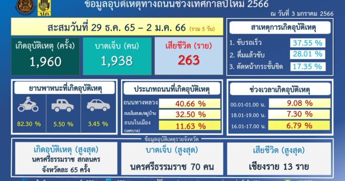 ศปถ. สรุปอุบัติเหตุทางถนนสะสมช่วง 5 วันช่วงเทศกาลปีใหม่ 2566 เกิดอุบัติเหตุรวม 1,960 ครั้ง บาดเจ็บรวม 1,938 ราย เสียชีวิตรวม 263 ราย เชียงราย มีผู้เสียชีวิตสะสมสูงสุด 13 ราย