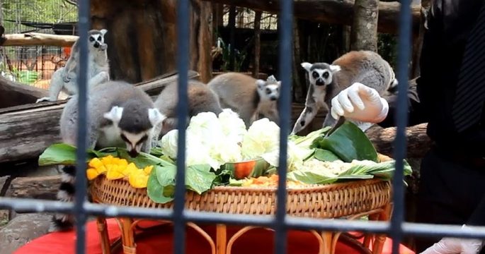 นครราชสีมา 5 เม.ย.- สวนสัตว์โคราชจัดเลี้ยงโต๊ะจีนผลไม้และบุฟเฟ่ต์บาร์บีคิวให้กับลีเมอร์และลิงกระรอกตัวจิ๋ว สร้างสีสันเอาใจน้องๆ หนูๆ นักท่องเที่ยวตัวน้อยที่มาเที่ยวชมในช่วงปิดเทอมใหญ่นี้ สวนสัตว์นครราชสีมา ต.ไชยมงคล อ.เมืองนครราชสีมา จัดกิจกรรมพิเศษต้อนรับช่วงปิดเทอมใหญ่ โดยจัดเลี้ยงโต๊ะจีน ประกอบด้วย ผักผลไม้หลายชนิด เช่น ผักกวางตุ้ง กล้วยน้ำว้าสุก มะละกอสุก องุ่น แอปเปิล แครอท และหนอนนก ให้กับลีเมอร์หางแหวนและลีเมอร์สีน้ำตาล ที่มีสมาชิก 9 ตัว เป็นสัตว์ตระกูลลิงแห่งหมู่เกาะมาดากัสการ์ นอกชายฝั่งตะวันออกของทวีปแอฟริกา นอกจากนี้ ยังจัดเลี้ยงบุฟเฟ่ต์บาร์บีคิวผลไม้ ประกอบด้วย องุ่น มะละกอสุก ฝรั่ง แครอท ให้กับลิงกระรอกตัวจิ๋วที่มีสมาชิก 6 ตัว เพื่อสร้างสีสันต้อนรับนักท่องเที่ยวช่วงปิดภาคเรียนฤดูร้อนนี้ ซึ่งแต่ละวันมีผู้ปกครองพาบุตรหลานมาเที่ยวชมสวนสัตว์นครราชสีมาอย่างคึกคัก ทั้งนี้ เด็กๆ และนักท่องเที่ยวสามารถมาเที่ยวชมสัมผัสความน่ารักน่าเอ็นดูและเรียนรู้พฤติกรรมของสัตว์ป่าตระกูลลิงตัวจิ๋วเหล่านี้ได้ที่ส่วนแสดงลีเมอร์และลิงกระรอก โดยสวนสัตว์นครราชสีมาจะจัดโต๊ะจีนและบุฟเฟ่ต์บาร์บีคิวให้กับสัตว์ป่าทั้ง 2 ชนิดดังกล่าว ในทุกวันเสาร์-อาทิตย์ และวันหยุดนักขัตฤกษ์.-สำนักข่าวไทย