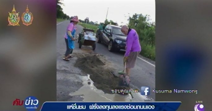 พบชาวต่างชาติและชาวบ้านช่วยลงขัน ซื้อปูนมาปิดหลุมกลางถนนบ้านสระแก้ว จ.บุรีรัมย์ หลังเกิดหลุมขนาดใหญ่หวั่นเกิดอุบัติเหตุ