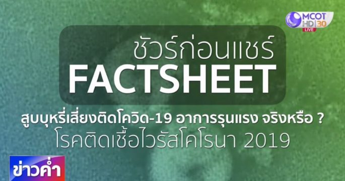 บนสังคมออนไลน์แชร์เตือนคนที่สูบบุหรี่ว่า มีโอกาสเสี่ยงติดโควิด-19 ได้ง่าย และเสี่ยงมีอาการที่รุนแรง เรื่องนี้เป็นอย่างไร ติดตามจากศูนย์ชัวร์ก่อนแชร์