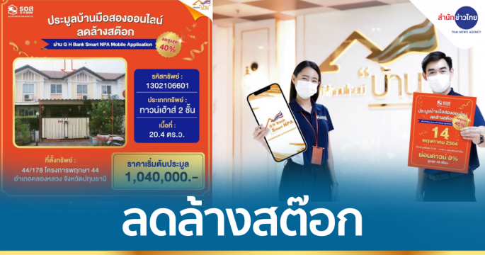 ลดล้างสต๊อกบ้านมือสอง! ธอส. ลดราคาทรัพย์ NPA สูงสุดถึง 40% ออกประมูลขายออนไลน์ผ่านแอป G H Bank Smart NPA ศุกร์ที่ 14 พ.ค.นี้