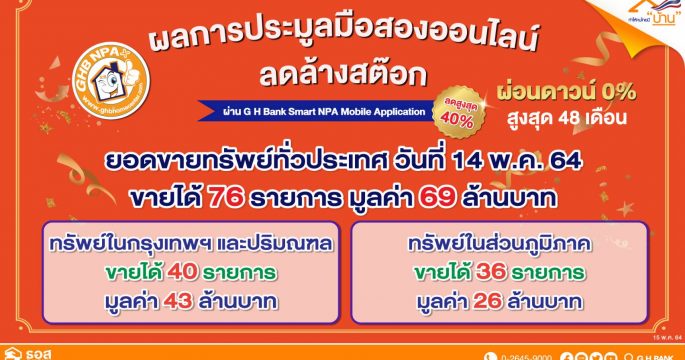 ผลประมูลบ้านมือสอง ธอส. ออนไลน์ผ่านแอป G H Bank Smart NPA ขายได้ 76 รายการ มูลค่า 69 ล้านบาท ภายใน 1 ชั่วโมง