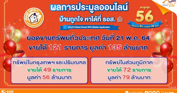 Hot ไม่เลิก! ธอส.ประมูลบ้านออนไลน์ ผ่าน Application : G H Bank Smart NPA ชั่วโมงเดียว ขายได้ถึง 121 รายการ มูลค่ากว่า 135 ล้านบาท