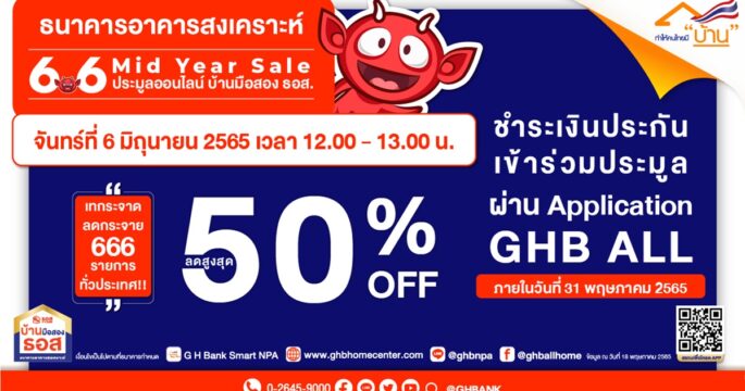 ธอส.จัดโปรแรงกลางปี!! บ้านมือสองลดราคาสูงสุดถึง 50% ที่งาน 6.6 Mid Year Sale ประมูลบ้านมือสองออนไลน์