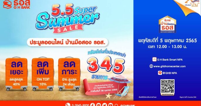 5.5 Super Summer Sale ธอส. ขนบ้านมือสองประมูลขายออนไลน์ โปรดับร้อนลดสูงสุด 40% พิเศษ!! ทำนิติกรรมภายในกำหนดลดเพิ่ม 10%
