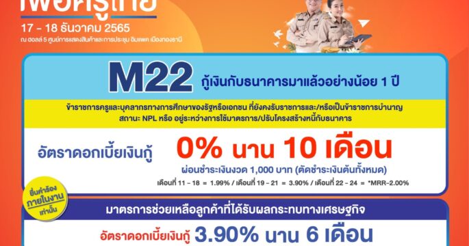 กรุงเทพฯ 16 ธ.ค.-ธอส. ช่วยเหลือครู จัดทำมาตรการแก้ไขหนี้ ลดดอกเบี้ย 0% ผ่อนชำระ 1,000 บาท นาน 2 ปี ในงานมหกรรมการเงินเพื่อครูไทย ระหว่างวันที่ 17-18 ธ.ค.65 ณ อิมแพ็ค เมืองทองธานี