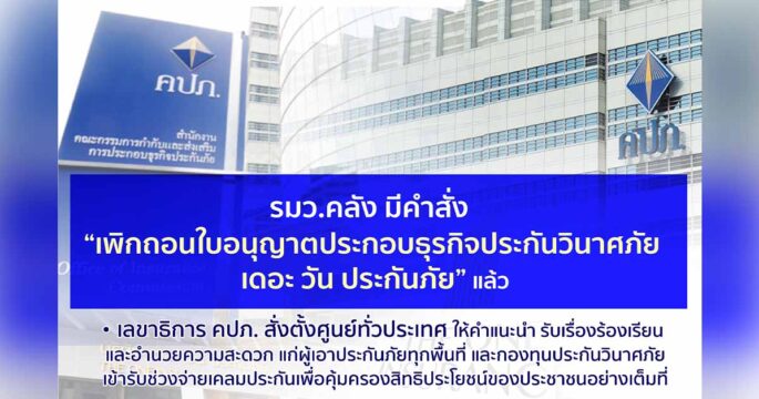 รมว.คลัง มีคำสั่ง “เพิกถอนใบอนุญาตประกอบธุรกิจประกันวินาศภัย เดอะ วัน ประกันภัย” เลขาธิการ คปภ. สั่งตั้งศูนย์ทั่วประเทศให้คำแนะนำ รับเรื่องร้องเรียน อำนวยความสะดวกแก่ผู้เอาประกันภัยทุกพื้นที่ และกองทุนประกันวินาศภัยเข้ารับช่วงจ่ายเคลมประกันเพื่อคุ้มครองสิทธิประโยชน์ของประชาชนอย่างเต็มที่