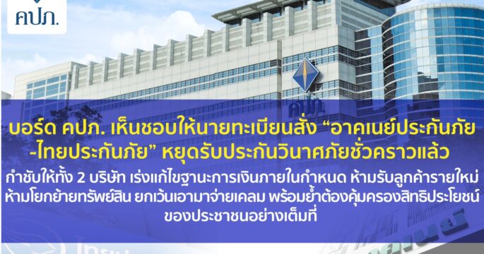 บอร์ด คปภ. เห็นชอบให้นายทะเบียนสั่ง “อาคเนย์ประกันภัย-ไทยประกันภัย” หยุดรับประกันวินาศภัยชั่วคราวแล้ว กำชับให้ทั้ง 2 บริษัท เร่งแก้ไขฐานะการเงินภายในกำหนด ห้ามรับลูกค้ารายใหม่ ห้ามโยกย้ายทรัพย์สิน ยกเว้นเอามาจ่ายเคลม พร้อมย้ำต้องคุ้มครองสิทธิประโยชน์ของประชาชนอย่างเต็มที่