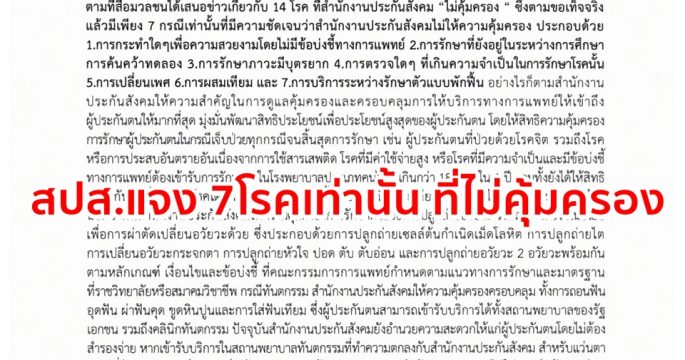 สำนักงานประกันสังคม แจงสื่อ ย้ำโรคยกเว้น มีแค่ 7 โรคเท่านั้น ที่ไม่ให้ความคุ้มครองผู้ประกันตน ไม่ใช่ 14 โรคตามที่เป็นข่าว