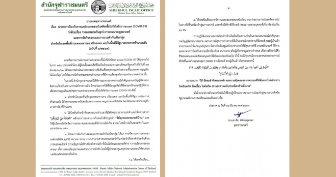 ประกาศจุฬาราชมนตรี ฉบับที่1 ดละหมาดวันศุกร์และละหมาดญามาอะห์ที่มัสยิด–อะซานแจ้งให้ทุกคนละหมาดที่บ้าน–งดกิจกรรมการรวมตัวเป็นกลุ่ม เพื่อหยุดการแพร่กระจายของเชื้อ
