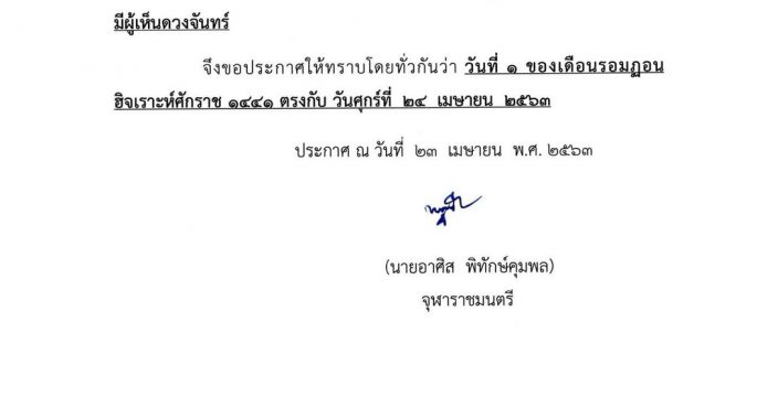 ประกาศจุฬาราชมนตรี เรื่อง กำหนดวันที่ 1 ของเดือนรอมฎอน ฮิจเราะห์ศักราช 1441