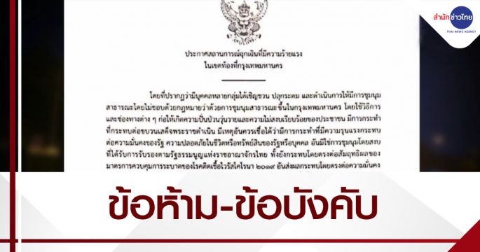 กรุงเทพฯ 15 ต.ค. – การประกาศสถานการณ์ฉุกเฉินที่มีความร้ายแรงในพื้นที่กรุงเทพมหานคร และปฏิบัติการขอคืนพื้นที่ ถ.พิษณุโลก ข้างทำเนียบรัฐบาล จากกลุ่มผู้ชุมนุมคณะราษฎร 2563 เมื่อช่วงเช้ามืดวันนี้ (15 ต.ค.) มีสาระสำคัญ ข้อห้าม ข้อบังคับ อย่างไร ติดตามจากรายงานของทีมข่าวการเมือง. – สำนักข่าวไทย