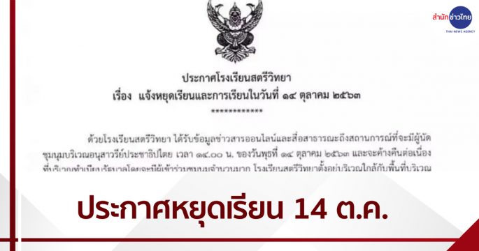 สำนักข่าวไทย 13 ต.ค.-รร.สตรีวิทยา ออกประกาศแจ้งหยุดเรียนวันที่ 14 ต.ค.นี้ เนื่องด้วยจะมีการนัดการชุมนุมบริเวณใกล้เคียงกับโรงเรียน โดยจะจัดการเรียนการสอนในรูปแบบออนไลน์ชดเชย นางวรรณดี นาคสุขปาน ผู้อำนวยการโรงเรียนสตรีวิทยา ลงนามในประกาศโรงเรียนสตรีวิทยา เรื่อง แจ้งหยุดเรียนและการเรียนในวันที่ 14 ตุลาคม 2563 ด้วยโรงเรียนสตรีวิทยาได้รับข้อมูลข่าวสารออนไลน์และสื่อสาธารณะถึงสถานการณ์ที่จะมีผู้นัดชุมนุมบริเวณอนุสาวรีย์ประชาธิปไตย เวลา 14.00 น. ของวันพุธที่ 14 ตุลาคม 2563 และจะค้างคืนต่อเนื่อง ที่บริเวณทำเนียบรัฐบาล โดยจะมีผู้เข้าร่วมชุมนุมจำนวนมาก โรงเรียนสตรีวิทยาตั้งอยู่บริเวณใกล้กับพื้นที่บริเวณอนุสาวรีย์ประชาธิปไตย เพื่อความสะดวกและปลอดภัย ในการเดินทางไป-กลับของนักเรียน โรงเรียนสตรีวิทยาจึงขอแจ้งหยุดเรียนในวันพุธที่ 14 ตุลาคม 2563 และการเรียนชดเชย โดยโรงเรียนจะจัดการเรียนการสอนในรูปแบบออนไลน์ชดเชย ขอให้นักเรียนเข้าเรียนทุกรายวิชาตามตารางเรียน ทำแบบฝึก ส่งงานให้แล้วเสร็จ ภายในวันพฤหัสบดีที่ 15 ตุลาคม 2563 เวลา 21.00 น. เพื่อให้สาระความรู้และเวลาเรียนครบตามหลักสูตร ทั้งนี้ หากโรงเรียนมีการเปลี่ยนแปลงใดๆ จะแจ้งผ่านเวบไซต์ของโรงเรียนเพื่อให้นักเรียนและผู้ปกครองทราบต่อไป ประกาศ ณ วันที่ 12 […]
