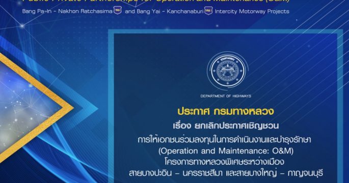 กรมทางหลวงยกเลิกประกาศเชิญชวนเอกชนร่วมลงทุนมอเตอร์เวย์สายบางปะอิน – นครราชสีมา และบางใหญ่ – กาญจนบุรี