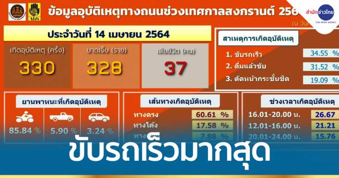 ศปถ.สรุปยอดการเกิดอุบัติเหตุประจำวันที่ 14 เม.ย.64 พบเกิดอุบัติเหตุ 330 ครั้ง ผู้บาดเจ็บ 328 คน สะสม 5 วัน เกิดอุบัติเหตุรวม 1,795 ครั้ง สาเหตุหลักมาจากขับรถเร็วและยานพาหนะที่เกิดอุบัติเหตุมากสุดคือมอเตอร์ไซค์