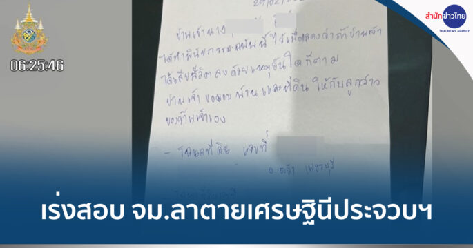 เร่งสอบจดหมายลาตาย เศรษฐินีเจ้าของธุรกิจสังฆภัณฑ์ใน จ.ประจวบคีรีขันธ์ หลังถูกพบเป็นศพพร้อมกับเลขานุการส่วนตัวภายในบ้านพัก