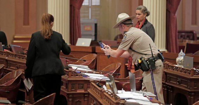 สตรีคนหนึ่งสาดของเหลวสีแดงอ้างว่าเป็นประจำเดือนจากระเบียงชั้นบนลงมาที่วุฒิสภารัฐแคลิฟอร์เนีย ขณะที่ ส.ว.กำลังอภิปรายร่างกฎหมายบังคับให้ฉีดวัคซีน