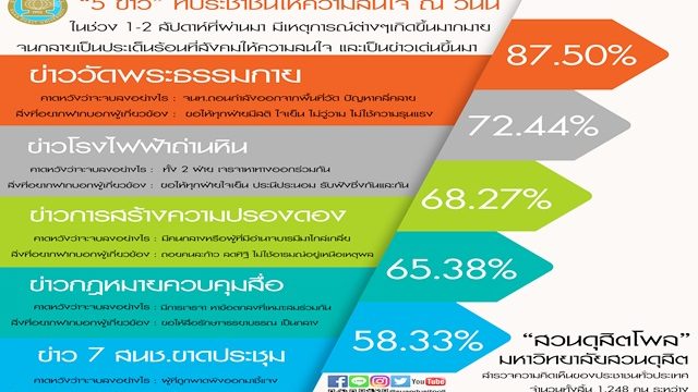 ผลสำรวจ 5 อันดับข่าวที่ประชาชนให้ความสนใจ อันดับ1 ข่าววัดพระธรรมกาย ฝากทุกฝ่ายที่เกี่ยวข้อง ขอให้มีสติ ใจเย็น ไม่ใช้ความรุนแรง