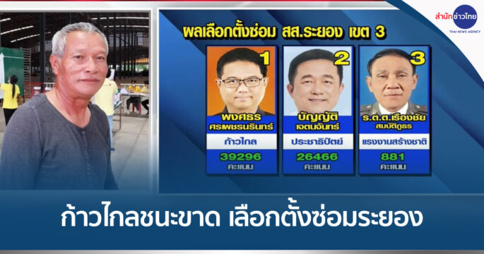 นับครบแล้วทุกหน่วย ผลเลือกตั้งซ่อม สส.ระยอง เขต 3 อย่างไม่เป็นทางการ นายพงศธร ศรเพชรนรินทร์ จากพรรคก้าวไกล ชนะขาด “หมอบัญญัติ” จากพรรคประชาธิปัตย์