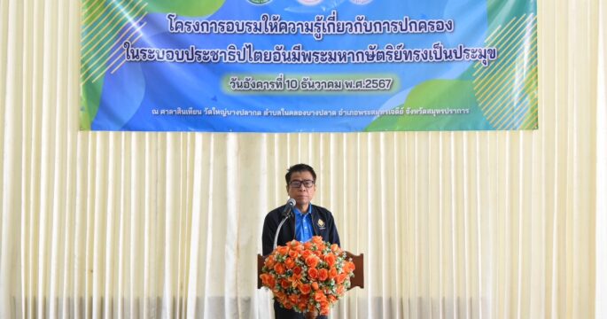 เลขาฯ กกต. เปิดอบรมให้ความรู้เกี่ยวกับการปกครองในระบอบประชาธิปไตยอันมีพระมหากษัตริย์ทรงเป็นประมุข แก่ประชาชนตำบลในคลองบางปลากด