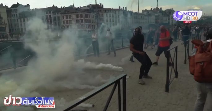 ตำรวจปราบจลาจลฝรั่งเศสยิงแก๊สน้ำตาและฉีดน้ำใส่กลุ่มผู้ประท้วงต่อต้านทุนนิยม ที่เมืองเบยอน ห่างจากเมืองบียาริสต์ซึ่งเป็นสถานที่จัดการประชุม จี-7 ราว 8 กิโลเมตร