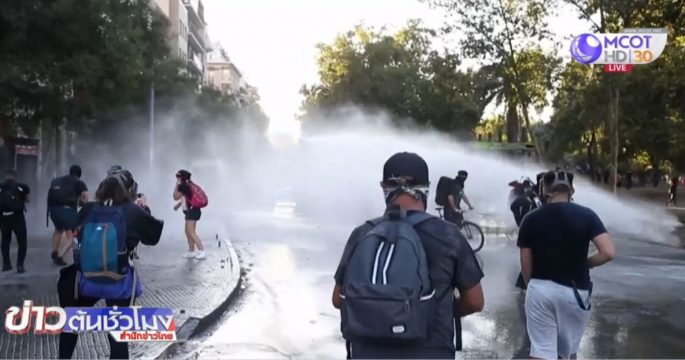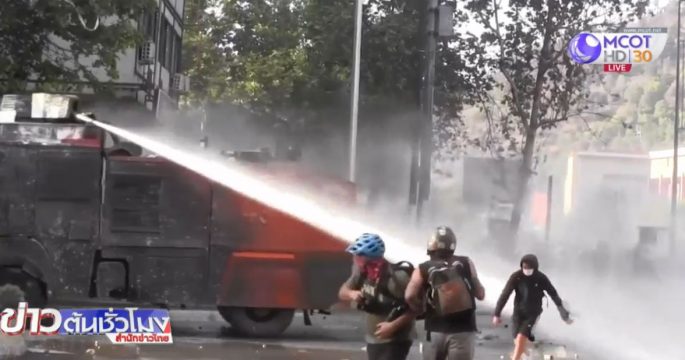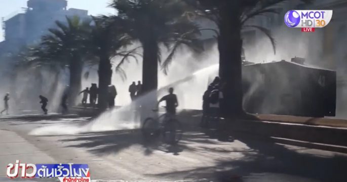 ตำรวจยิงแก๊สน้ำตาและใช้ฉีดน้ำสลายการชุมนุมของผู้ประท้วงที่รวมตัวกันบริเวณจัตุรัสกลางกรุงซานติอาโก้ ของชิลี เนื่องจากไม่พอใจเรื่องความเหลื่อมล้ำ