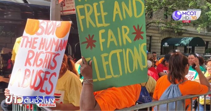 กลุ่มชาวต่างชาติ 25-30 คน ถือป้ายประท้วงเรียกร้องประชาธิปไตยในไทย หน้าโรงแรมที่พักนายกรัฐมนตรี ระหว่างเข้าร่วมประชุมสมัชชาสหประชาชาติ ที่นครนิวยอร์ก