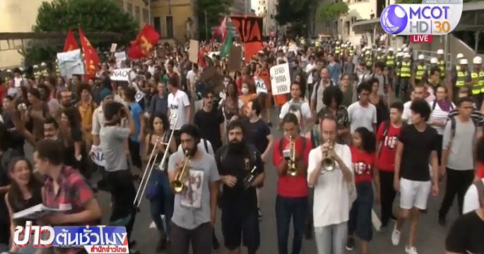 กลุ่มผู้ชุมนุมคัดค้านการขึ้นค่าโดยสาร กรูเข้าไปปิดกั้นถนนสายหลักสายหนึ่งในเมืองเซาเปาโล หลังฝ่าด่านของเจ้าหน้าที่ตำรวจได้