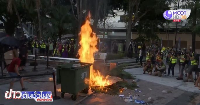 ผู้ประท้วงฮ่องกง เข้าไปทุบทำลายร้านค้าของชาวจีนในห้างสรรพสินค้า เหยียบย่ำธงชาติจีน รวมถึงทำลายทางเข้าสถานีรถไฟใต้ดิน พร้อมนำสิ่งของมาจุดไฟเผากลางถนน