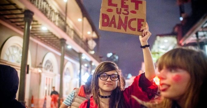 นักเต้นระบำเปลื้องผ้าเดินขบวนประท้วงพร้อมกับตะโกนว่าเรือนร่างของพวกเขาไม่ได้ผิดกฎหมาย เพื่อประท้วงคำสั่งปิดคลับทั้งบริเวณในและรอบถนนเบอร์เบิน