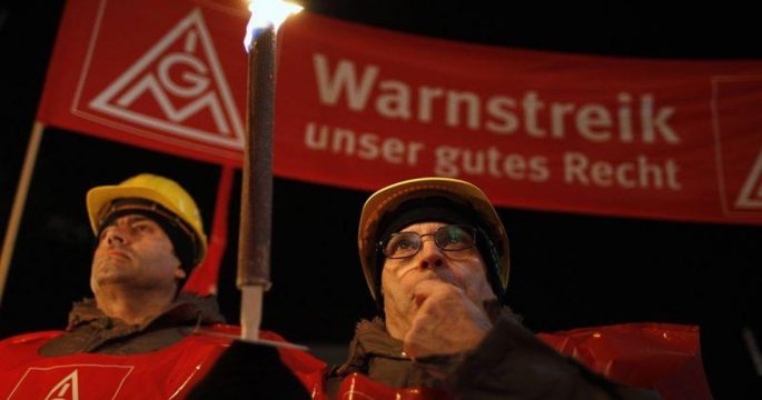 พนักงานสหภาพแรงงานเหล็กและโลหะในเยอรมนีจัดการผละงานประท้วงครั้งใหญ่ตั้งแต่วันจันทร์นี้เพราะไม่พอใจเรื่องค่าจ้างและเวลาการทำงาน