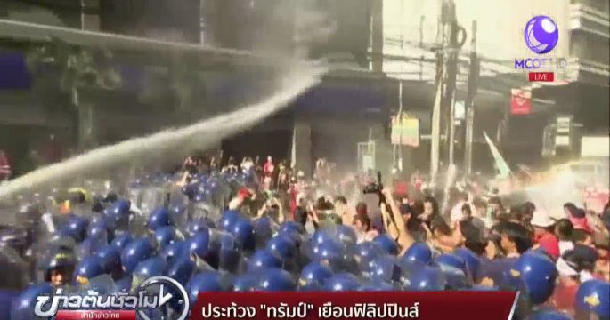 ตำรวจฟิลิปปินส์ใช้ท่อน้ำแรงดันสูงฉีดน้ำเข้าใส่ฝูงชนจำนวนมากที่มาร่วมตัวกันในกรุงมะนิลา เพื่อเดินขบวนต่อต้านการมาเยือนของประธานาธิบดีโดนัลด์ ทรัมป์ ผู้นำสหรัฐ ที่มีกำหนดจะเดินทางมายังฟิลิปปินส์