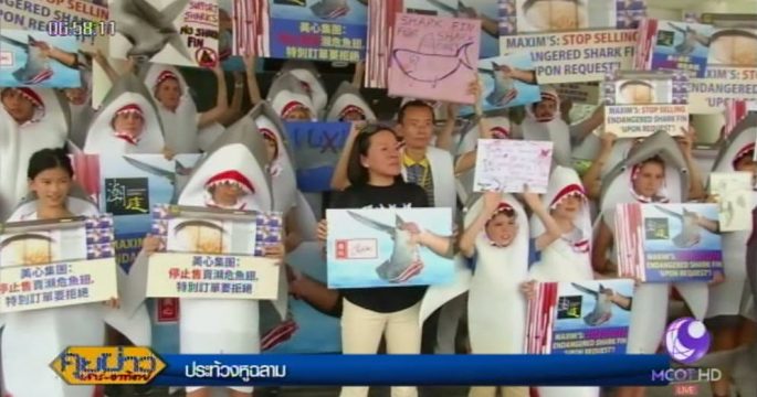 ผู้ชุมนุมประท้วงสวมชุดฉลามถูกตัดครีบแล้วไปชุมนุมรอบร้านอาหารใกล้อ่าวฮ่องกง เพื่อเรียกร้องให้ยุติการจำหน่ายอาหารหรือซุปหูฉลามที่ทำจากครีบฉลาม