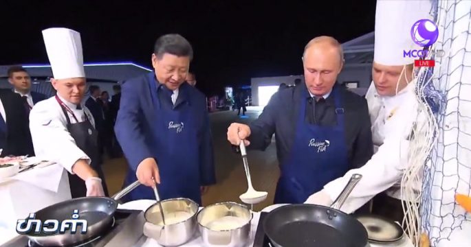 ความสัมพันธ์ระหว่างผู้นำรัสเซียและผู้นำจีนแน่นแฟ้น โดยประธานาธิบดีวลาดิเมียร์ ปูติน และประธานาธิบดีสี จิ้นผิง ร่วมกันทำแพนเค้กด้วยกันอย่างชื่นมื่น ระหว่างพักการประชุมเศรษฐกิจตะวันออก อีสเทิร์น อีโคโนมิก ฟอรัม ที่เมืองวลาดิวอสต็อกของรัสเซีย