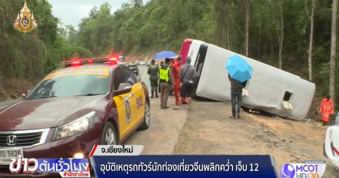 รถทัวร์นักท่องเที่ยวชาวจีนประสบอุบัติเหตุ ขณะเดินทางไปเที่ยวเชียงราย บาดเจ็บเล็กน้อย 12 คน คนขับเผยรถเสียการควบคุม ก่อนแหกโค้งพลิกคว่ำบริเวณไหล่ทาง