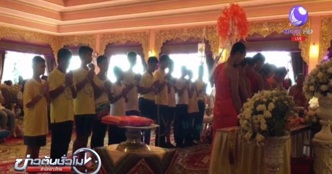 นักเตะทีมหมูป่าอะคาเดมีและโค้ชเอก พร้อมครอบครัว ทำบุญสืบชะตาต่ออายุตามประเพณีล้านนา ที่วัดพระธาตุดอยเวา อ.แม่สาย จ.เชียงราย