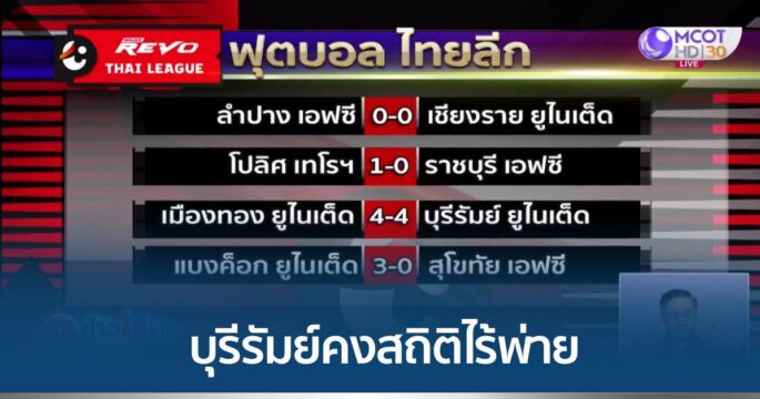 “ปราสาทสายฟ้า” บุรีรัมย์ ยูไนเต็ด ไล่ตามตีเสมอ “กิเลนผยอง” เมืองทอง ยูไนเต็ด 4-4 ในช่วงทดเวลาการแข่งขัน ยังคงสถิติไร้พ่ายต่อไป ในศึกฟุตบอลไทยลีก