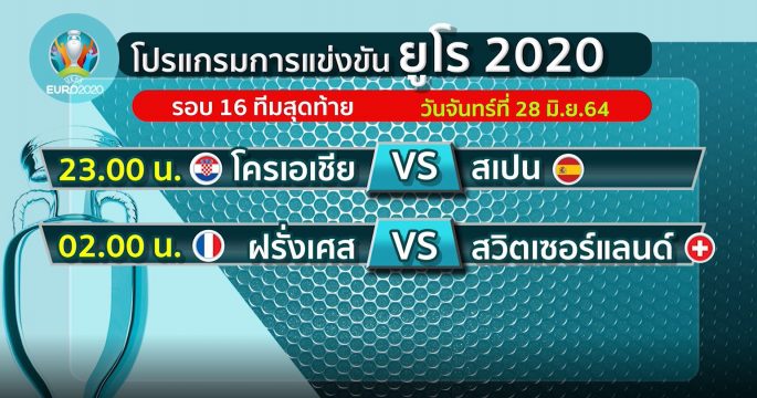 ฟุตบอลยูโร 2020 รอบ 16 ทีมสุดท้าย คืนนี้ แข่งขัน 2 คู่ เวลา 23.00 น. โครเอเชีย พบ สเปน และ 02.00 น. ฝรั่งเศส พบ สวิตเซอร์แลนด์
