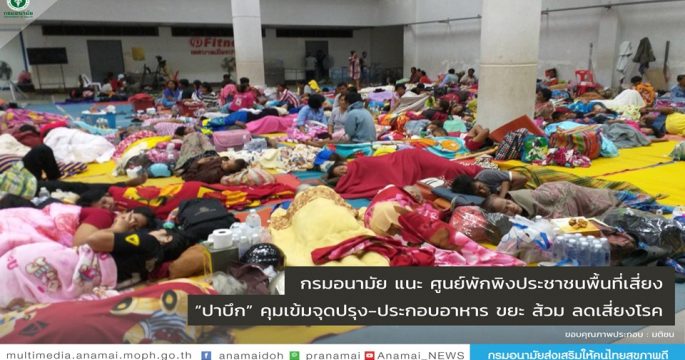 กรมอนามัยแนะศูนย์พักพิงให้ความสำคัญในการปรุงประกอบอาหาร เน้นปรุงร้อน สะอาดถูกสุขลักษณะ จัดการสุขาภิบาลอาหารและสิ่งแวดล้อม ขยะ ใช้ส้วมอย่างถูกต้องเพื่อป้องกันโรค