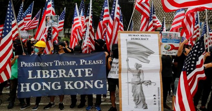 ผู้ประท้วงในฮ่องกงพากันร้องเพลงชาติสหรัฐขณะเคลื่อนขบวนไปตามท้องถนนในวันนี้ และเรียกร้องให้ประธานาธิบดีโดนัลด์ ทรัมป์ของสหรัฐช่วยปลดแอกฮ่องกง