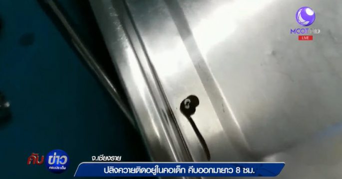 สยอง แพทย์โรงพยาบาลเชียงราย คีบปลิงควายออกจากลำคอเด็กชาวลาว ตะลึงความยาว 8 เซนติเมตร