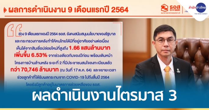 ธอส. เผยผลการดำเนินงาน 9 เดือนแรกปี 64 ปล่อยสินเชื่อใหม่ทำให้คนไทยมีบ้านได้แล้ว 1.66 แสนล้านบาท เพิ่มขึ้น 6.53% จากช่วงเดียวกันของปี 2563