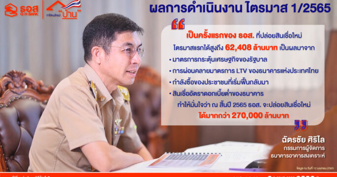 ธอส.โชว์ผลการดำเนินงานไตรมาสแรกปี 65 ปล่อยสินเชื่อใหม่ให้คนไทยมีบ้านได้ 62,408 ล้านบาท เพิ่มขึ้น 33.21%