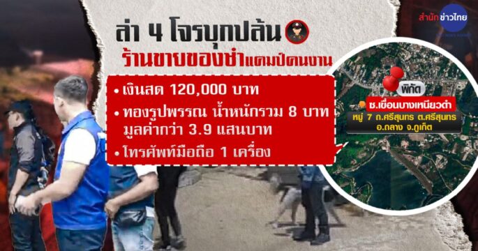 คนร้าย 4 คน สวมหมวกกันน็อก ปล้นร้านขายของชำของชาวเมียนมา ในแคมป์ก่อสร้างกลางเมืองภูเก็ต กวาดทองคำ 8 บาท และเงินสดกว่า 1 แสนบาท ตำรวจเร่งแกะรอยคนร้าย
