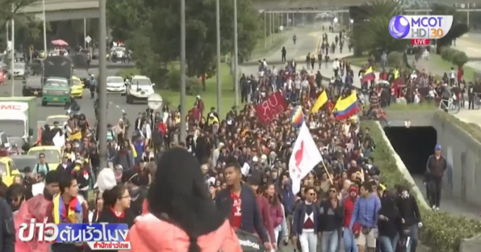 กลุ่มผู้ประท้วงเดินขบวนไปตามท้องถนนในเมืองหลวงของโคลอมเบีย เรียกร้องให้รัฐบาลยกเลิกแผนปฏิรูปภาษี การประท้วงบานปลายกลายเป็นการปะทะรุนแรงระหว่างตำรวจกับกลุ่มผู้ประท้วง
