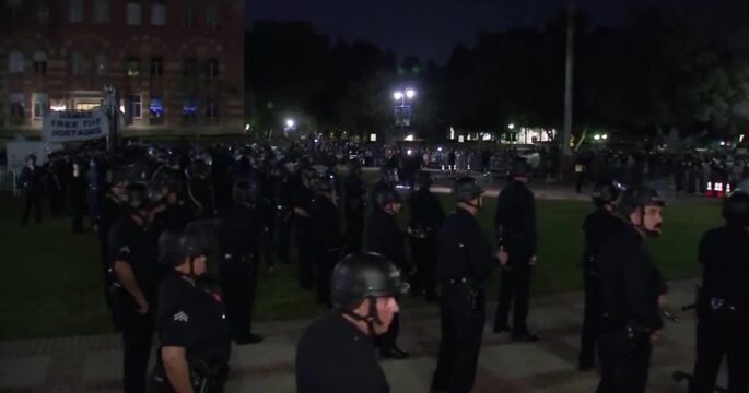 เจ้าหน้าที่รักษากฎหมายระดมกำลังกันเป็นจำนวนหลายร้อยคนในบริเวณมหาวิทยาลัยแคลิฟอร์เนียในลอสแอนเจลิส หรือ ยูซีแอลเอ เมื่อช่วงค่ำในคืนวันพุธ เพื่อเตรียมการสำหรับการสลายการชุมนุม