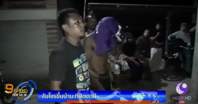ชาวบ้านโสร่ง ต.เขาตูม อ.ยะรัง จ.ปัตตานี ช่วยกันจับตัวหัวขโมยขึ้นบ้านส่งตำรวจ