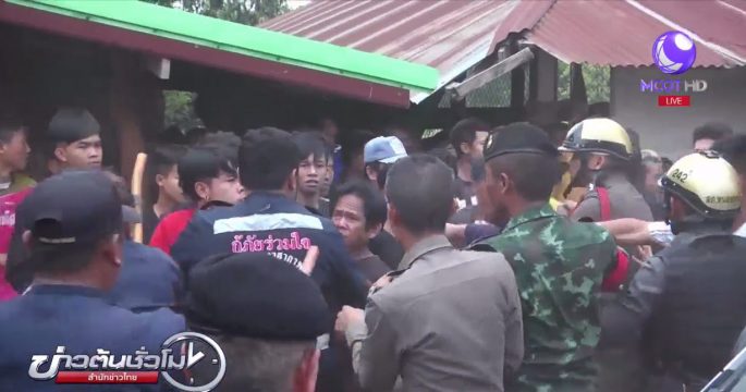 ตำรวจกาฬสินธุ์คุมตัวนายปั้ม ผู้ต้องหายิงเยาวชนวัย 16 ปีเสียชีวิต เมื่อวันที่ 20 เม.ย.ที่ผ่านมา ทำแผนประกอบคำรับสารภาพบริเวณจุดเกิดเหตุ มีชาวบ้านมามุงดูเหตุการณ์จำนวนมาก จนเกิดชุลมุนผู้ต้องหาหวิดถูกรุมประชาทัณฑ์